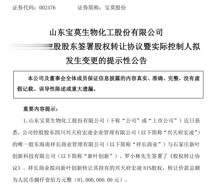 近日,山东宝莫生物化工股份有限公司(以下简称“宝莫股份”)发布公告,公司间接控股股东完成股权转让,实际控制人由罗小林、韩明夫妇变更为胡瀚阳。此次交易距离2024年1月的上一轮控制权变更不足两年。