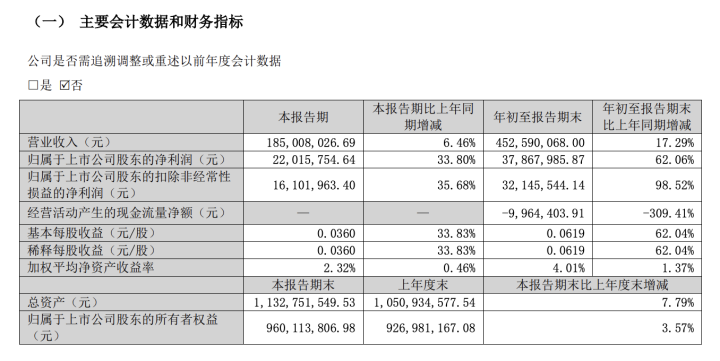 2025年第三季度报告显示,前三季度营收4.53亿元,净利润3786.8万元,同比分别增长17.29%和62.06%。然而,同期经营活动产生的现金流量净额为-996.44万元,同比下滑309.41%,现金流与利润数据呈现差异。